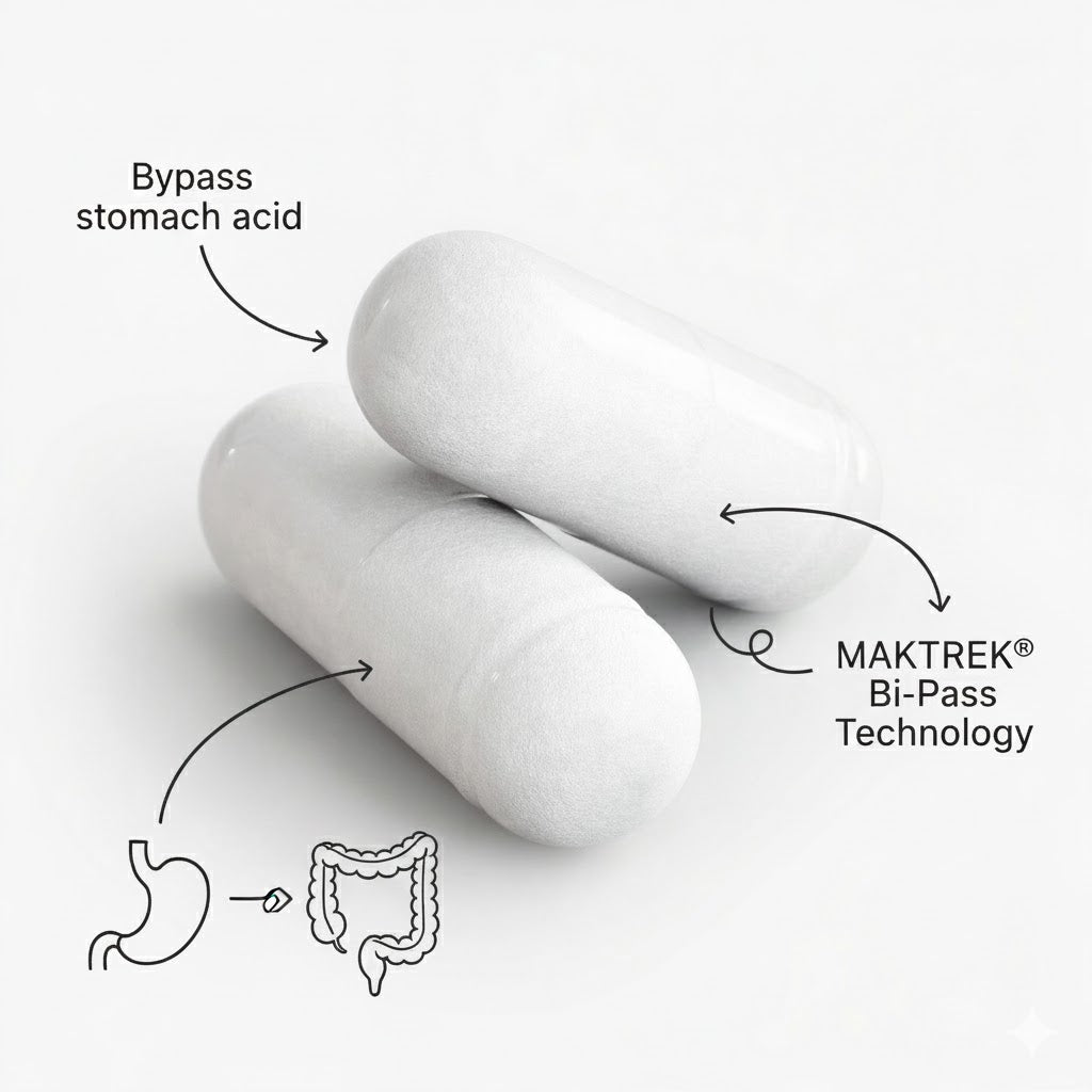 Our MAKTREK® Bi-Pass Technology is a natural seaweed-derived shield that forms a protective gel around the probiotics. This allows them to survive the harsh stomach acid and release later in the gut — where they can actually do their job.